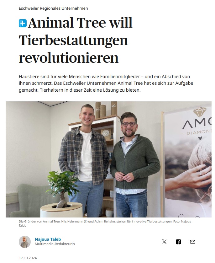 Aachener Zeitung Eschweiler Regionales Unternehmen + Animal Tree will Tierbestattungen revolutionieren © Aachener Zeitung – von Multimedia-Redakteurin Najoua Taleb Haustiere sind für viele Menschen wie Familienmitglieder […]
